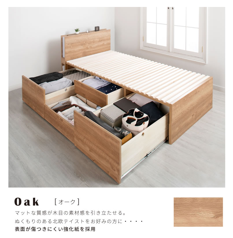 角丸スリム棚付き:棚の再度部分に曲線を取り入れることでお部屋にやわらかい雰囲気を与えてくれます。  マットレスはこだわりの日本製の物から機能性に優れた輸入品まで幅広く取り扱っております。日本製で低ホルムアルデヒド部材を使ったこだわりの大型引き出し収納ベッド 。収納スペースを確保したい方におすすめです。